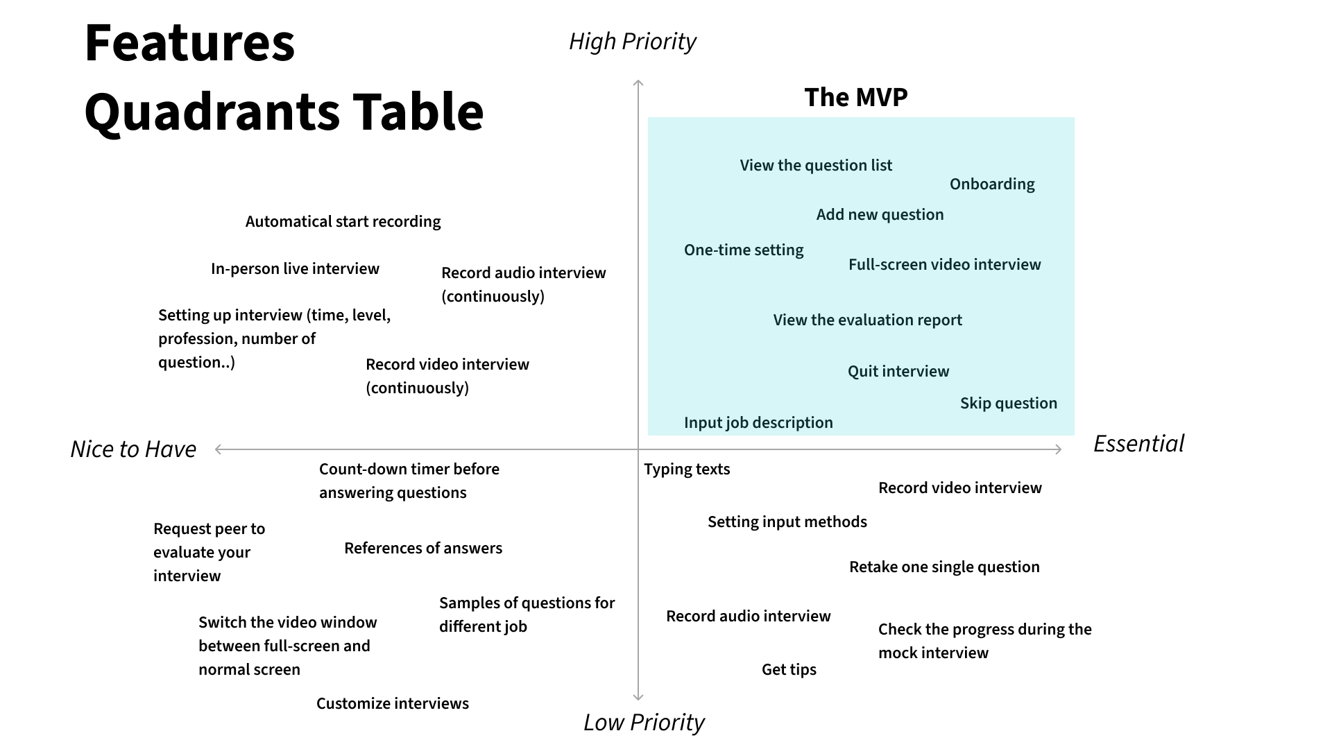 To help us identify the features that would be core to the MVP (Minimum Viable Product). I scheduled a few meetings with the founder and the CTO, to define the features listed according to:
